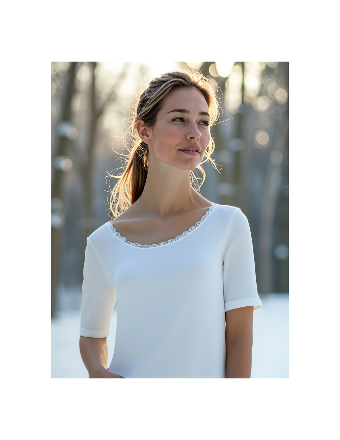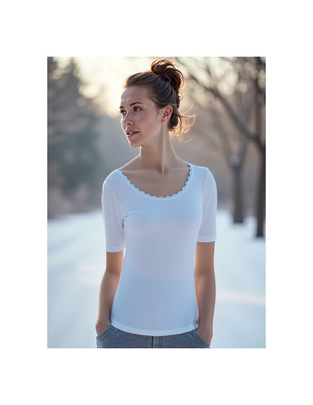 Mooi thermo shirt van Gino Santi met korte mouwen in het wit voor Dames. Het thermo shirt is gemaakt van een holle vezel viscose waardoor het uitstekend isoleert, ideaal als onderlaag voor de koude barre temperaturen buiten. De shirts voelen erg zacht aan en zijn afgewerkt met een klein kanten boordje dat onder uw kleding valt.
