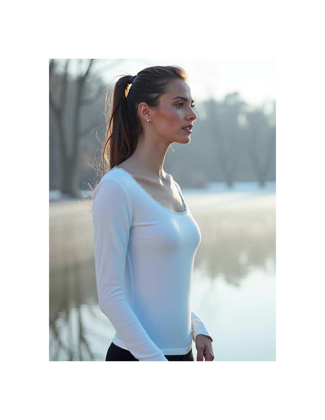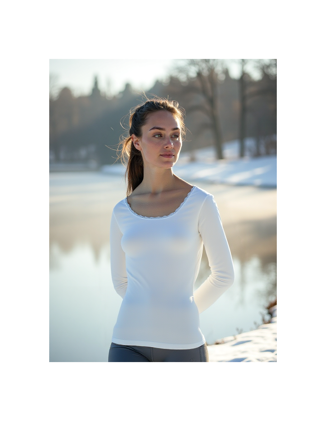 Mooi thermo shirt van Gino Santi met lange mouwen in het wit voor Dames. Het thermo shirt is gemaakt van een holle vezel viscose waardoor het uitstekend isoleert, ideaal als onderlaag voor de koude barre temperaturen buiten. De shirts voelen erg zacht aan en zijn afgewerkt met een kleine kanten boord die onder uw kleding valt.